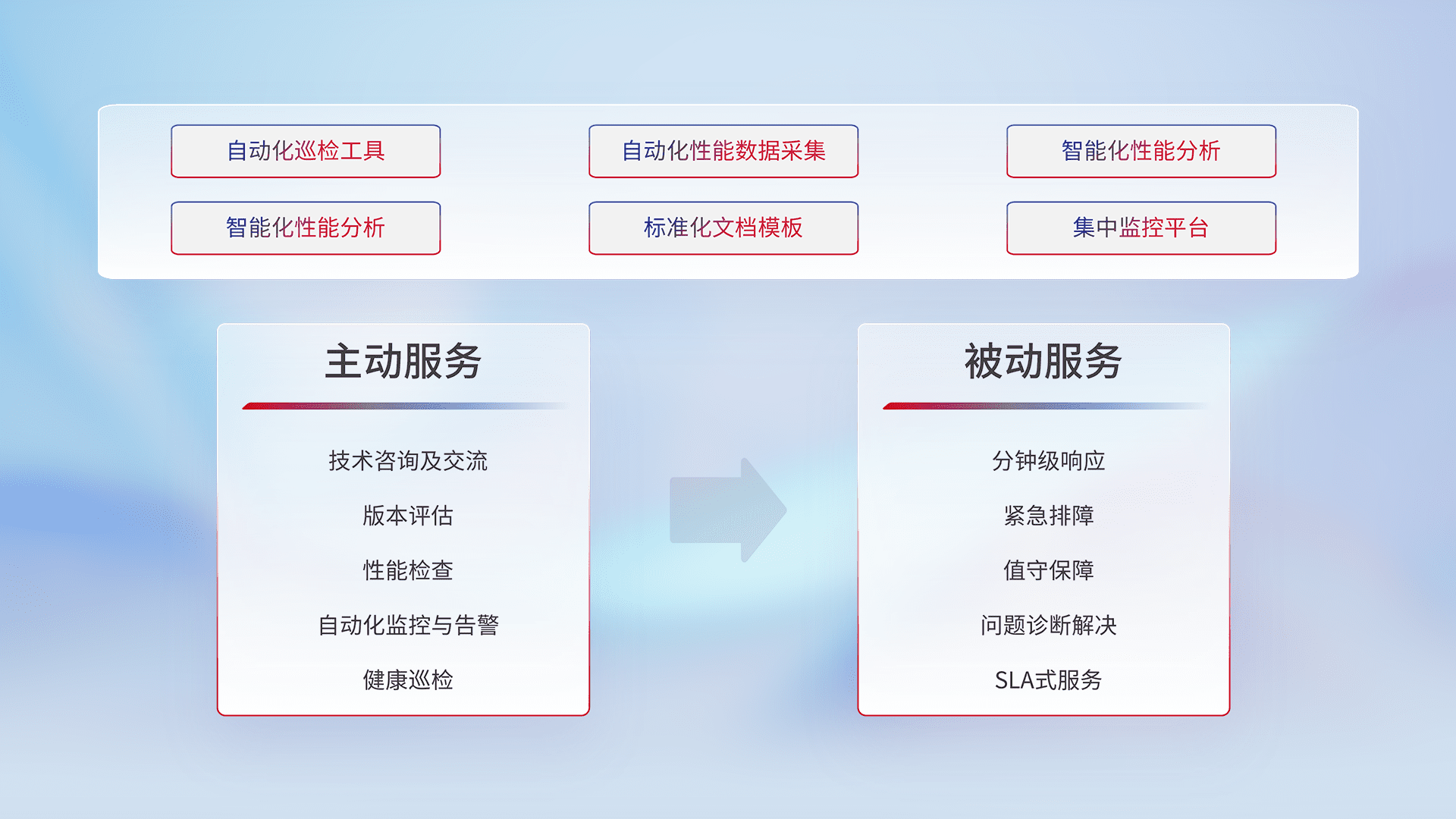 智能化工具和标准化文档,,保障服务质量,,,,提供主动服务(包含技术咨询、、、版本评估、、性能检查、、自动化监控与告警、、健康巡检)和被动服务包含(分钟级响应、、、紧急排障、、、、值守保障、、问题诊断解决、、、、SLA服务)。。。